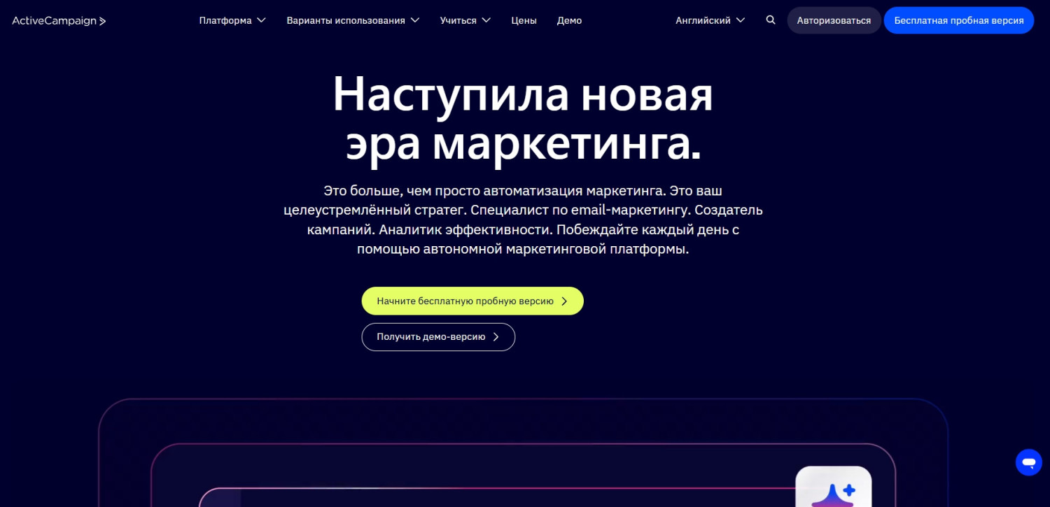 ActiveCampaign - это профессиональная платформа автоматизации маркетинга, сочетающая мощный функционал email-маркетинга, CRM и машинное обучение. Сервис ориентирован на бизнес, готовый перейти от массовых рассылок к персонализированному взаимодействию с клиентами.