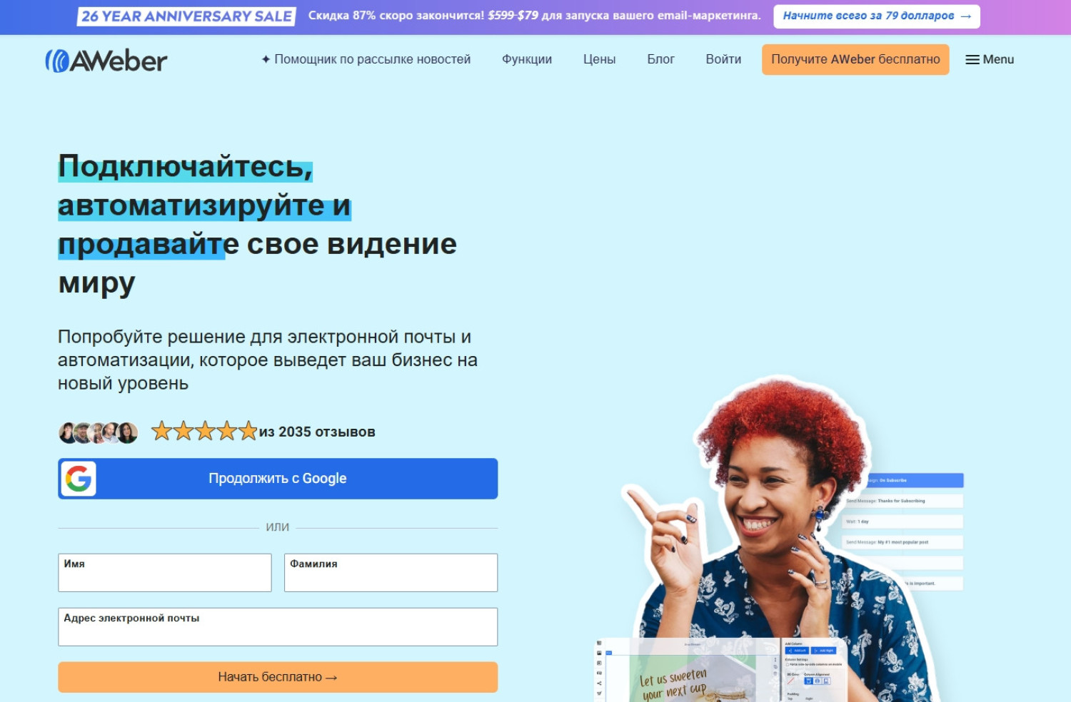 AWeber - это один из старейших и проверенных временем сервисов email-маркетинга, ориентированный на малый бизнес, предпринимателей и создателей контента. Платформа сочетает в себе надежность, простоту использования и достаточный функционал для эффективных коммуникаций с аудиторией.