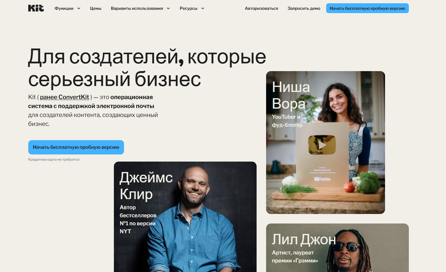 Kit (ранее ConvertKit) - это мощная платформа для email-маркетинга и автоматизации, созданная специально для профессиональных блогеров, создателей контента и цифровых предпринимателей. Она фокусируется на эффективном росте аудитории и монетизации через гибкие инструменты взаимодействия с подписчиками.