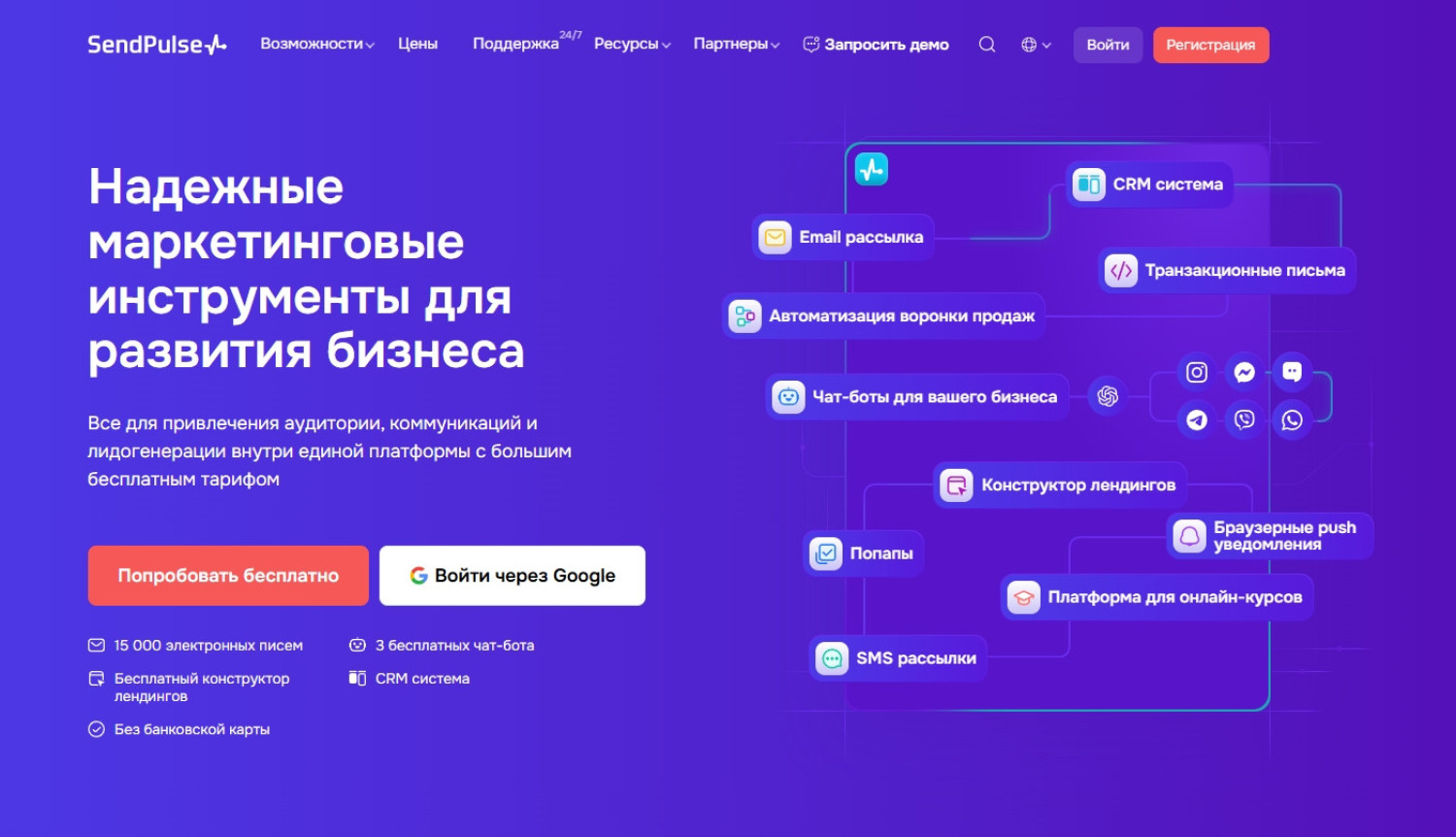 SendPulse - это многофункциональная маркетинговая платформа, которая выходит далеко за рамки просто email-рассылок. Сервис позиционирует себя как «всё-в-одном» и идеально подходит для предпринимателей, которые хотят управлять коммуникациями по нескольким каналам из единого центра.