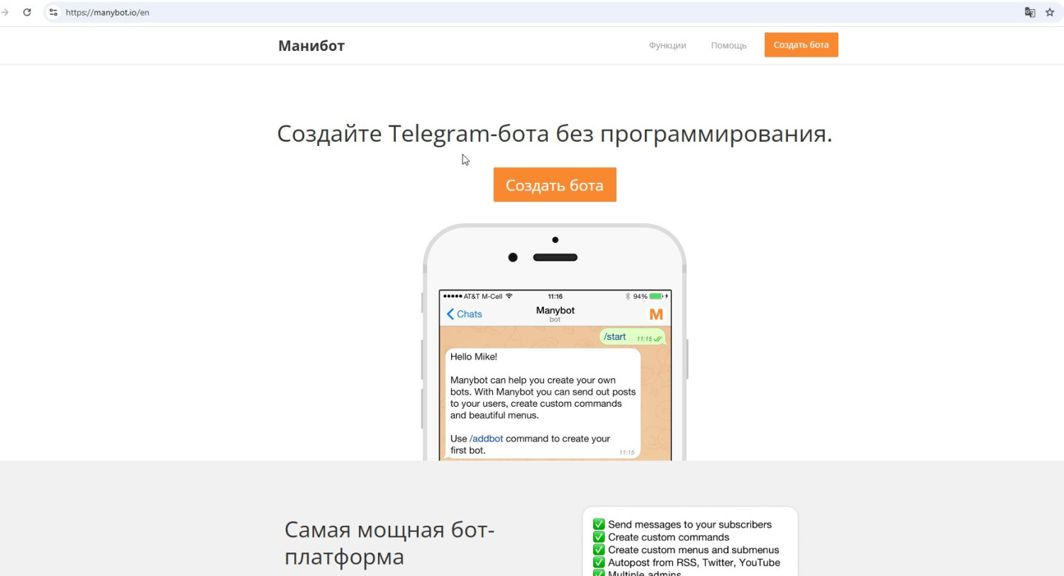 - Один из самых популярных сервисов - Manybot. Это конструктор ботов для Telegram и ВКонтакте, который на бесплатном тарифе позволяет создать бота, настроить автоматические ответы и отправлять сообщения подписчикам, которые запустили диалог с ботом.