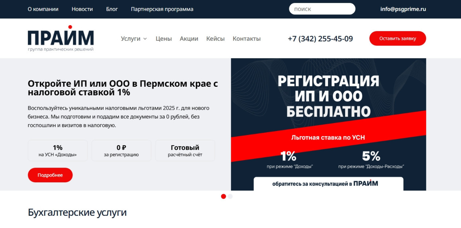 Бухгалтерская компания ПРАЙМ предлагает услуги полного бухгалтерского и налогового сопровождения бизнеса на аутсорсинге, ориентируясь на компании, которые предпочитают делегировать ведение бухгалтерии профессионалам.
