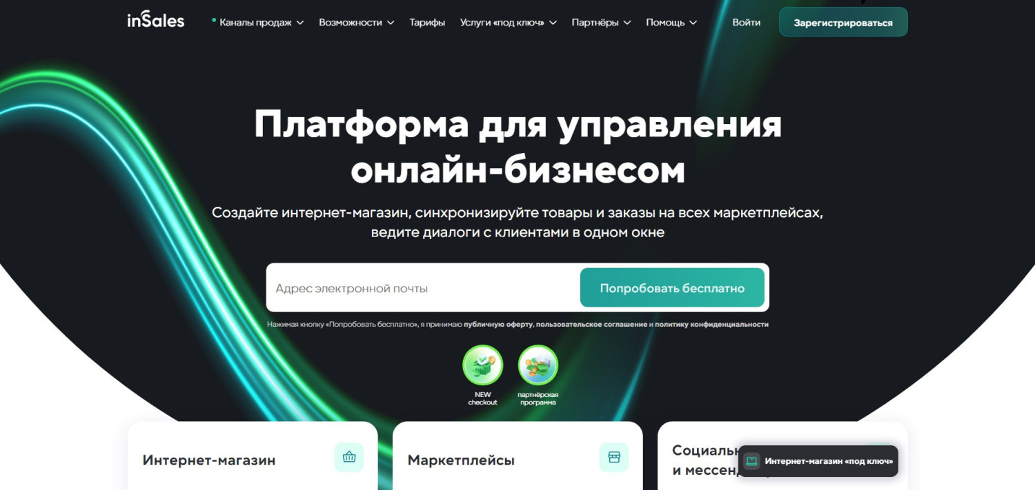 InSales - один из ветеранов российского рынка e-commerce, предлагающий сбалансированное решение «всё в одном» для быстрого запуска интернет-магазина. Платформа отличается исключительной простотой освоения и мощными встроенными маркетинговыми инструментами, что позволяет начать продажи буквально за несколько часов. Она идеально подходит для предпринимателей, которые ценят готовые интеграции и не хотят разбираться в технических тонкостях.