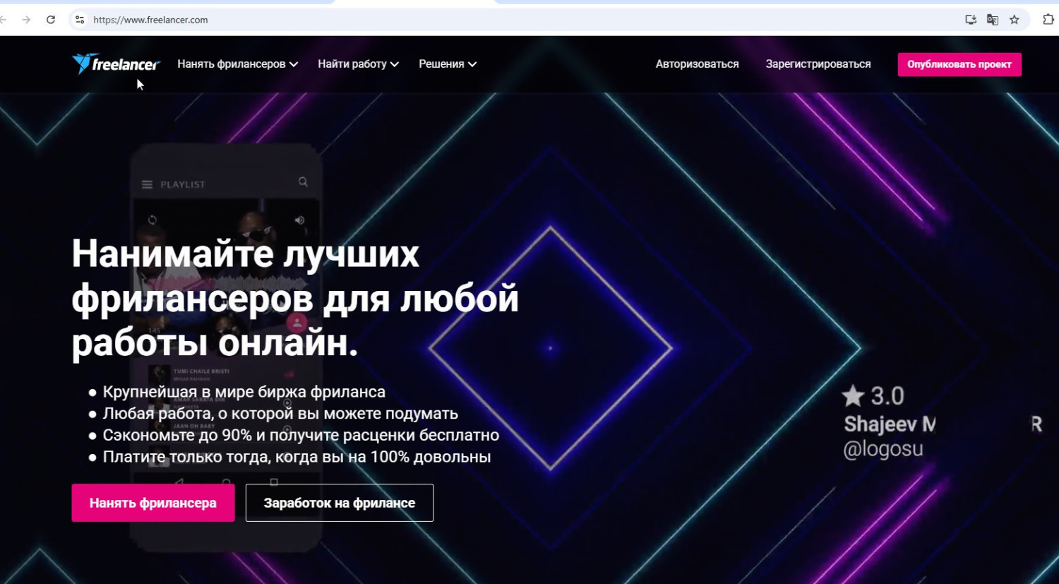 Freelancer.com - Одна из старейших международных бирж с огромным потоком разнообразных проектов. Есть система конкурсов, где можно проявить навыки. Подходит для новичков, чтобы набрать опыт. Часто встречаются проекты с небольшим бюджетом и высокая конкуренция.