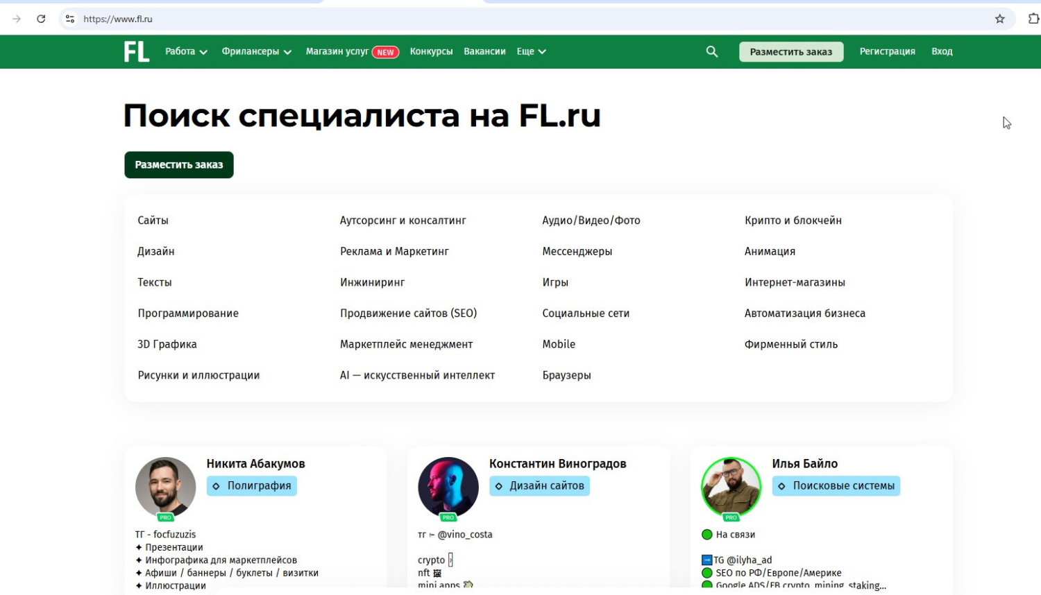 FL.ru - Ведущая русскоязычная биржа с широким спектром заказов. Активное сообщество и привычный для СНГ интерфейс. Есть система конкурсов и PRO-аккаунтов для повышения видимости. К минусам относят высокую комиссию и значительную долю бюджетных проектов.