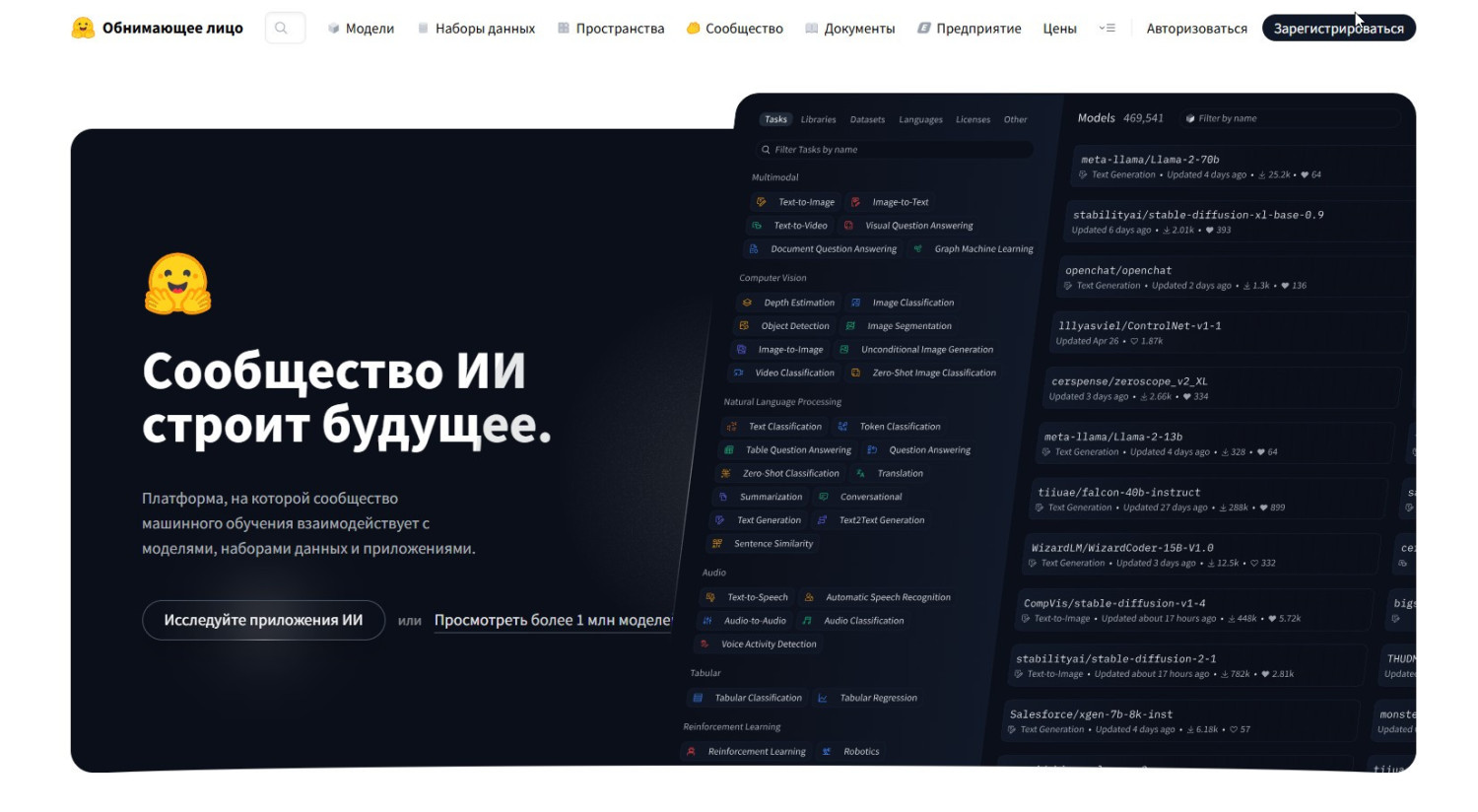Hugging Face - это фундаментальная инфраструктура мира ИИ, своеобразный «GitHub для машинного обучения». Платформа предоставляет доступ к десяткам тысяч открытых моделей, наборов данных и готовых решений. Здесь разработчики могут найти, протестировать и развернуть практически любую модель - от гигантов вроде Llama 3 до узкоспециализированных решений. Это инструмент для исследований, кастомизации и создания собственных продуктов на базе передовых нейросетевых архитектур.