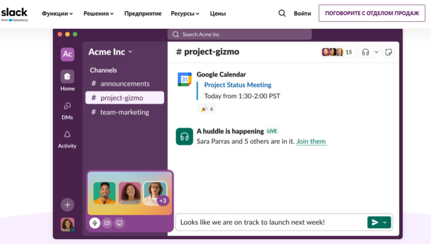 Мощная функция поиска в Slack позволяет пользователям находить сообщения, файлы или даже отдельные фрагменты кода по всем каналам и в прямых сообщениях. Голосовые и видеозвонки, общий доступ к экрану и перегруженные темы позволяют использовать его как для быстрой синхронизации, так и для подробного обсуждения.