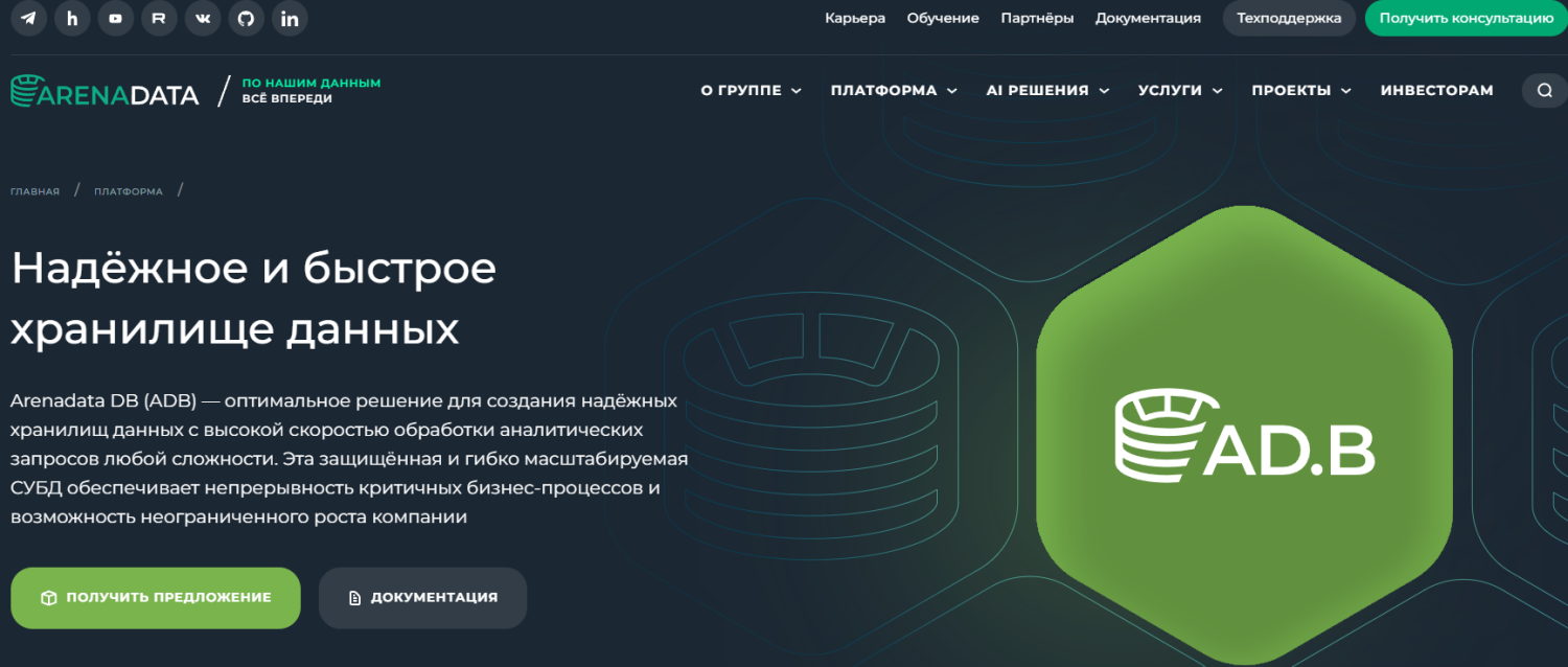 Платформа Arenadata DB, основанная на открытых технологиях Hadoop и Greenplum, предлагает комплексное решение для работы с большими данными в соответствии с российскими требованиями. Система включает инструменты для извлечения, преобразования и загрузки данных, а также их последующего анализа.