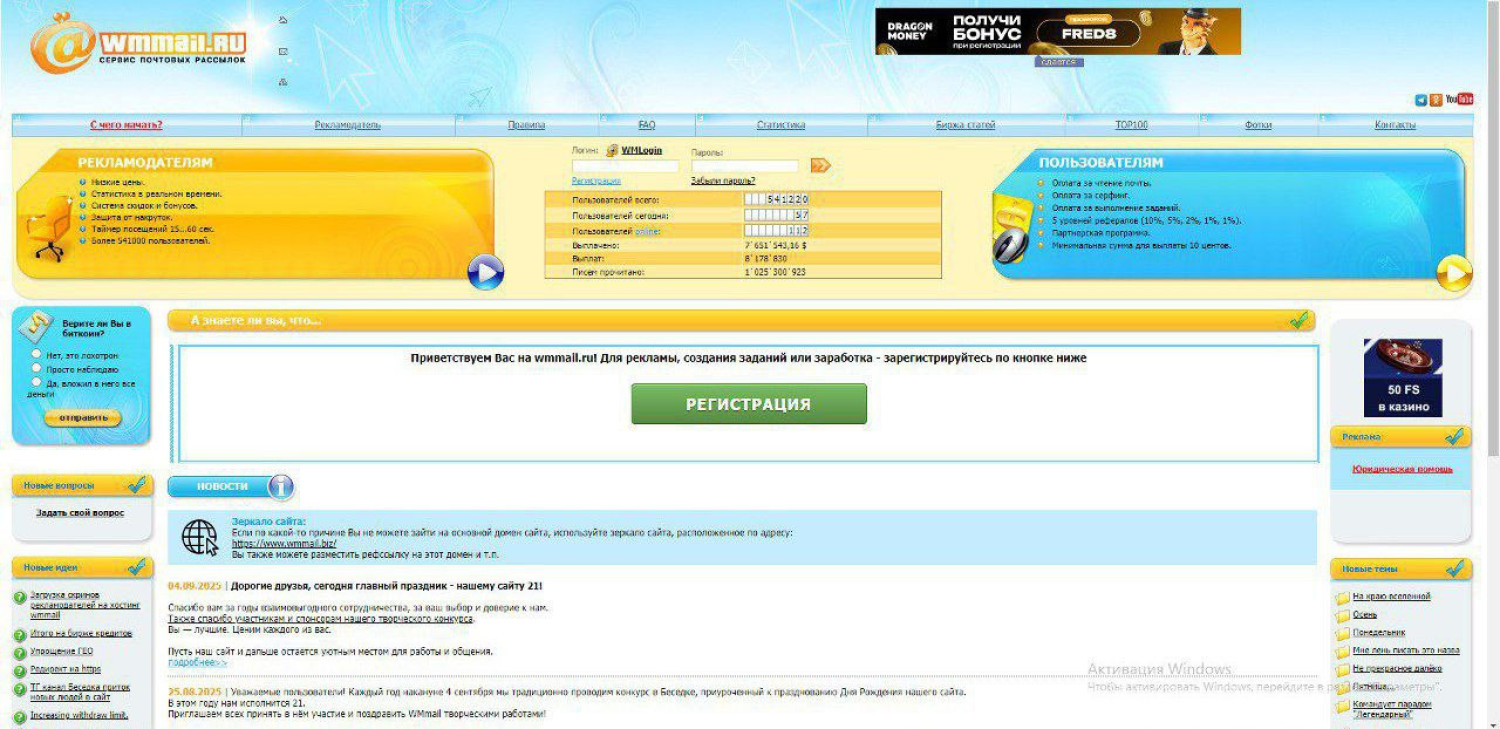 Несмотря на то, что Wmmail уже не так активен, многие вспоминают его как школу заработка. Именно здесь тысячи людей впервые поняли, что интернет способен приносить реальные деньги. Даже простые клики дали толчок для освоения других направлений онлайн-работы. Для многих это стало фундаментом, на котором позже строился более серьёзный доход.