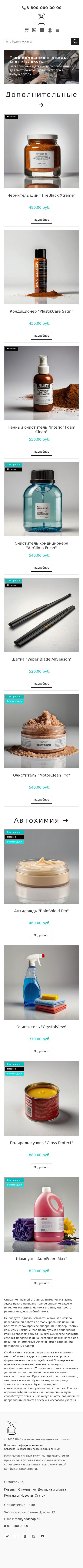 Специализированный шаблон интернет-магазина для продажи автомобильных химических средств и аксессуаров, разработанный с учетом специфики категории товаров. Технологичный дизайн в сине-белой гамме с графическими элементами, имитирующими молекулярные структуры, подчеркивает научный подход к уходу за автомобилем. Адаптивная верстка обеспечивает удобный просмотр каталога на любых устройствах — от мобильных телефонов в гараже до планшетов на автосервисе.