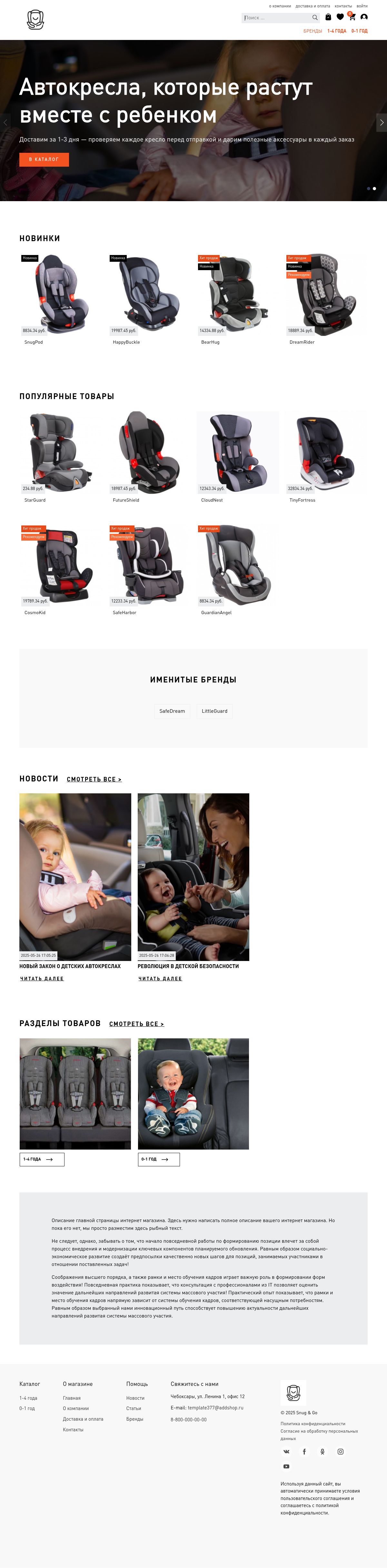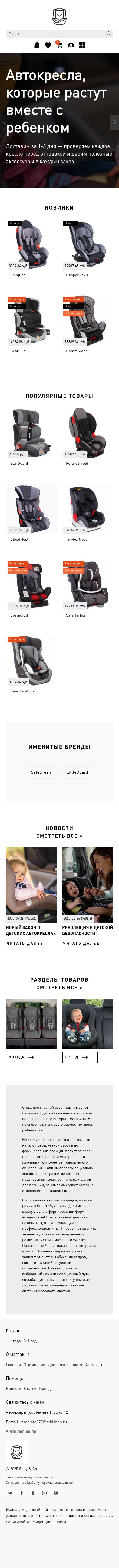 Шаблон полностью адаптирован для мобильных устройств, что позволяет совершать покупки в любое время и в любом месте. Владельцу магазина доступны инструменты для управления ассортиментом, акциями и скидками, а также возможность создания тематических подборок, например, «Лучшие автокресла для путешествий» или «Экономичные варианты без потери качества». Это решение на конструкторе интернет магазинов Addshop идеально подходит как для небольших детских магазинов, так и для крупных сетей, предлагая покупателям удобный и надежный способ выбрать лучшее автокресло для своего ребенка.