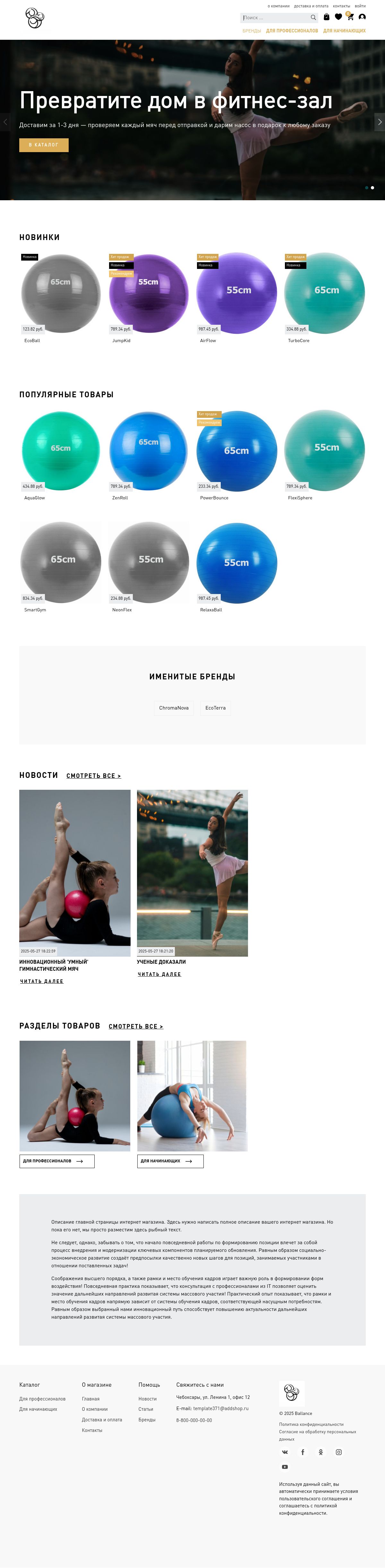 Готовый шаблон интернет магазина гимнастических мячей на Addshop создан для любителей фитнеса, реабилитации и домашних тренировок, предлагая удобную платформу для выбора качественного спортивного инвентаря. Дизайн в стиле "активной жизни" сочетает яркие сочные цвета с динамичными элементами, передающими энергию движения и здорового образа жизни. Магазин предлагает разнообразный ассортимент: от классических фитболов разных диаметров до массажных моделей с пупырышками, включая детские варианты, мячи для пилатеса и профессиональные решения для физиотерапии.