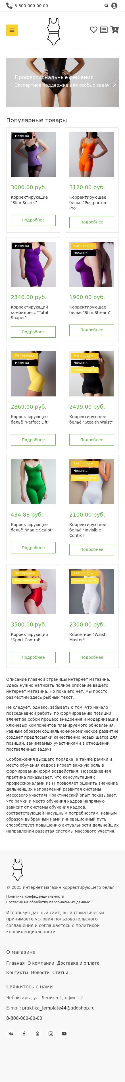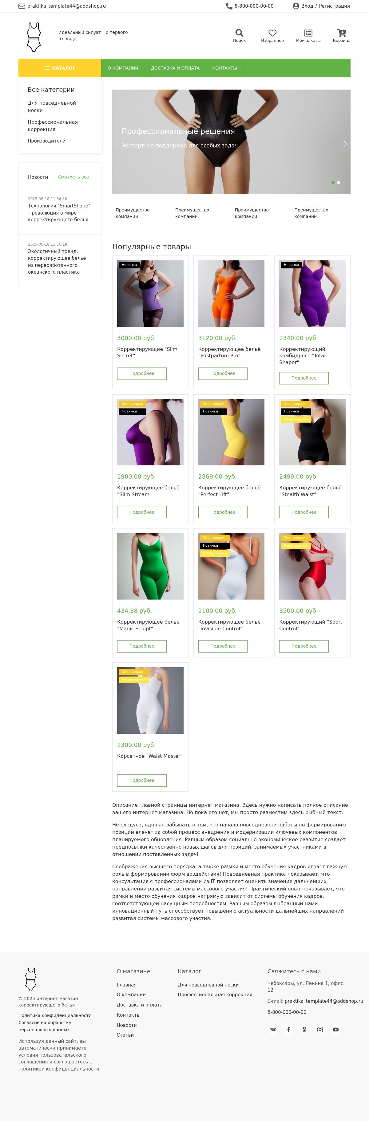 Готовый шаблон интернет магазина корректирующего белья на Addshop создан для презентации и продажи качественных моделей, помогающих создать идеальный силуэт. Дизайн выполнен в нежных пастельных тонах с акцентами на женственность и комфорт, что сразу создает доверительную атмосферу для покупательниц. Магазин предлагает удобную систематизацию товаров по категориям: утягивающее белье, корректирующие боди и корсеты, моделирующие трусы, компрессионные колготки и специальные серии для послеродового восстановления, позволяя легко ориентироваться в ассортименте.