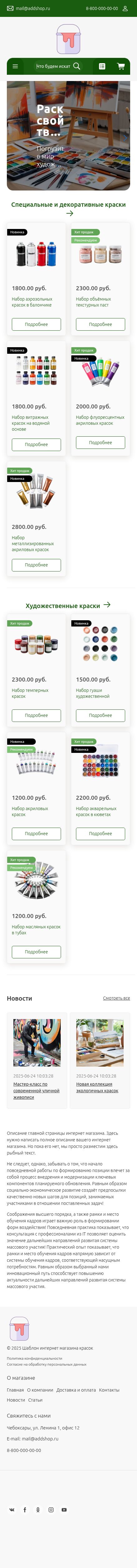 Этот шаблон интернет-магазина на Addshop создан для художников, дизайнеров и творческих личностей, где богатая палитра цветов и художественная эстетика подчеркивают безграничные возможности самовыражения. Главная страница оформлена как мастерская живописца — здесь в организованных блоках представлены масляные краски, акварельные наборы, акриловые коллекции и редкие пигменты ручного приготовления. Умная система фильтрации позволяет сортировать товары по типу связующего вещества (льняное масло, гуммиарабик, полимерная эмульсия), светостойкости (I, II, III категории), консистенции (пастообразные, жидкие, твердые) и специализированному назначению (фрески, роспись по ткани, реставрационные работы). Особый интерес вызывает интерактивный "Цветовой конструктор" с возможностью создания авторских оттенков и их сохранения в персональной палитре, а также раздел "Химия цвета" с подробным описанием происхождения каждого пигмента — от малахитовой зелени до современного фталоцианина.