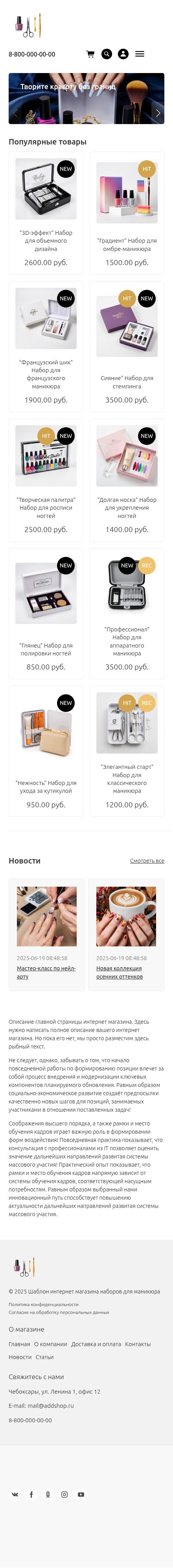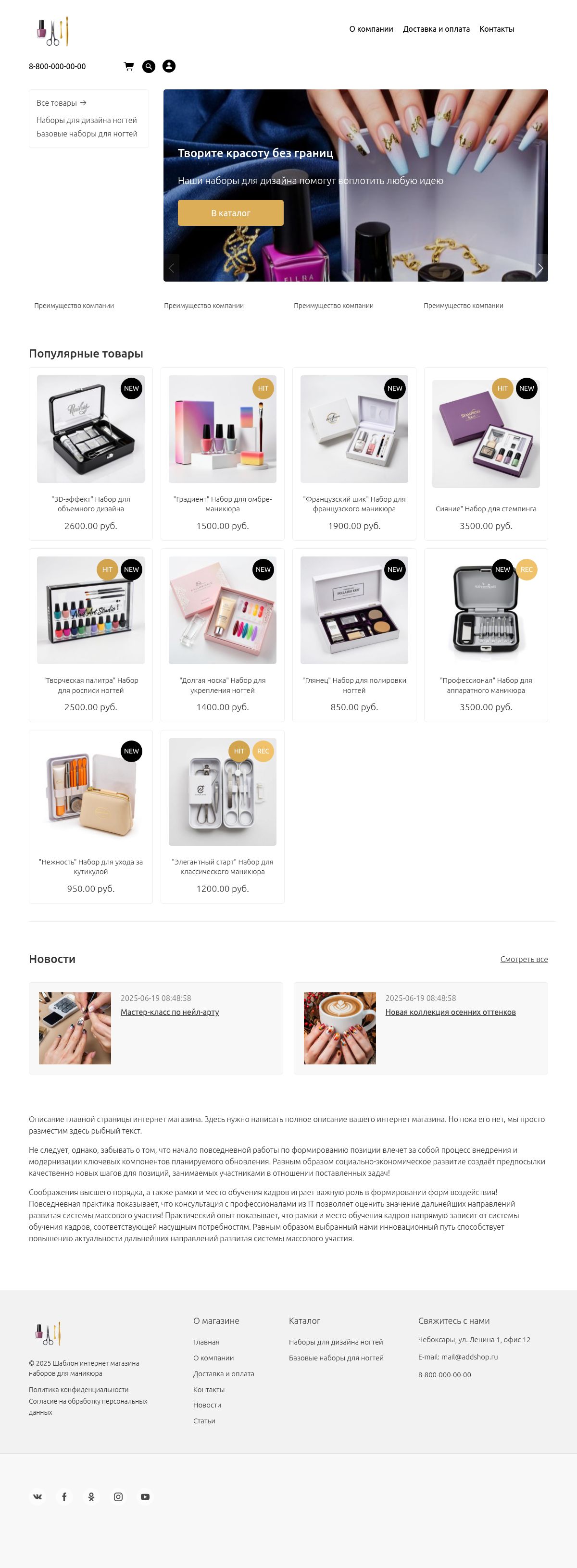Этот шаблон интернет магазина идеально подходит для создания стильного и функционального интернет-магазина, специализирующегося на наборах для маникюра. Он разработан с учетом особенностей ниши, обеспечивая удобство навигации и привлекательное оформление товаров.