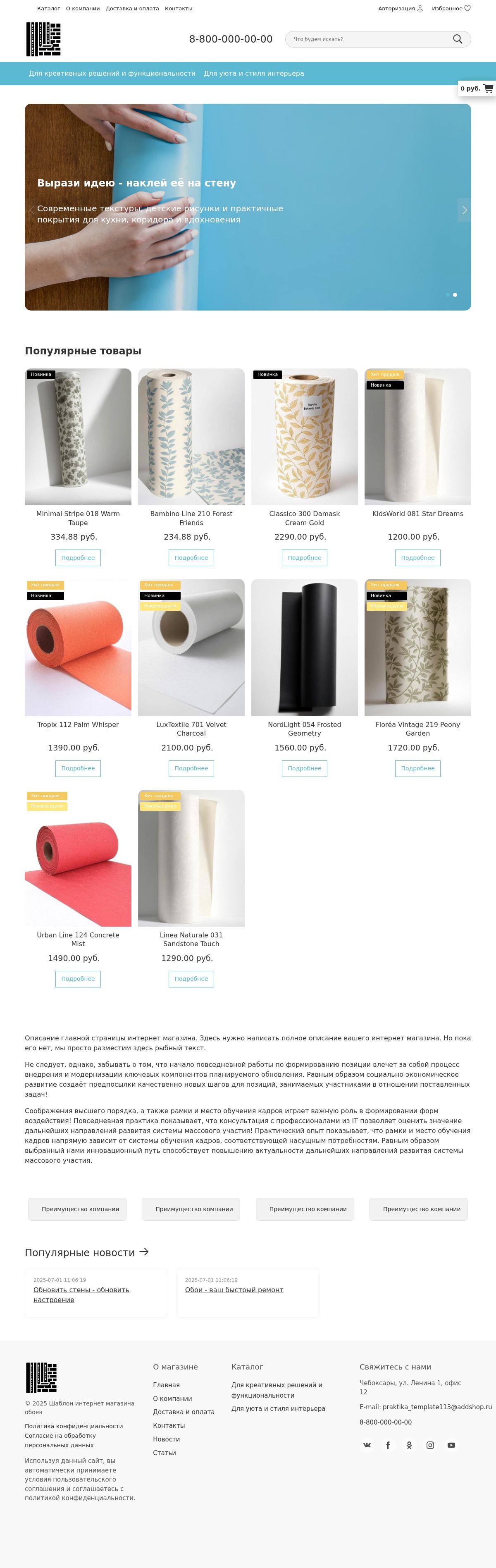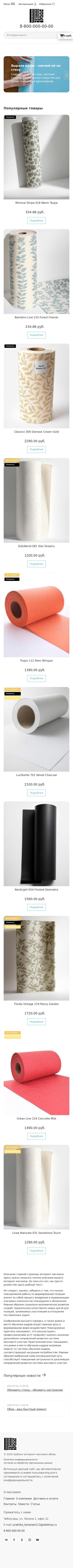 Этот шаблон интернет-магазина на Addshop создан специально для продажи обоев и декоративных покрытий для стен, предлагая удобное решение для покупателей, которые ценят стиль и качество в оформлении интерьера. Чистый, визуально привлекательный дизайн с акцентами на цветовые решения позволяет легко оценить фактуры и оттенки обойных коллекций. Главная страница интуитивно разделяет ассортимент по ключевым категориям: флизелиновые, виниловые, бумажные и текстильные обои, фотообои, а также специализированные покрытия для кухни и ванной, что помогает быстро найти нужный вариант.