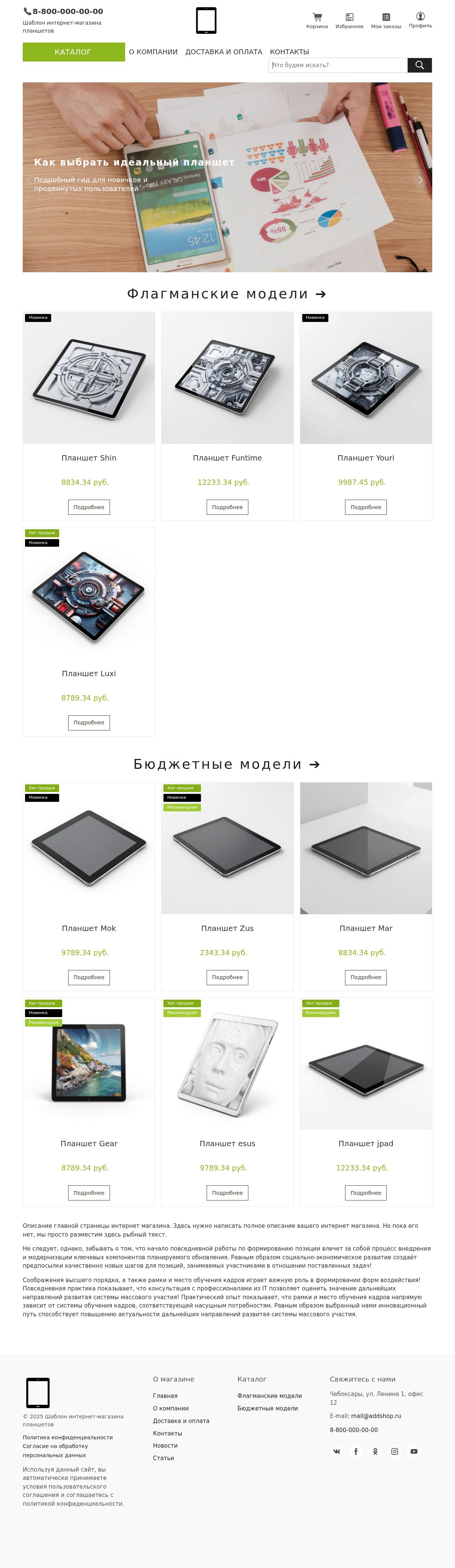 Этот шаблон интернет-магазина на Addshop создан для ценителей мобильных технологий, где современный дизайн с технологичными акцентами подчеркивает инновационность представленных планшетов. Главная страница оформлена как витрина цифровых устройств с динамичной подачей новинок и хитов продаж — здесь в стильных категориях представлены модели для работы, творчества и развлечений. Умная система фильтров позволяет сортировать устройства по ключевым параметрам: диагональ экрана (от 7 до 13 дюймов), разрешение дисплея, производительность (процессор, объем ОЗУ), емкость аккумулятора и специальным функциям (поддержка стилуса, 4G/LTE, HDR). Особый интерес вызывает раздел "Сравнение поколений" с наглядной демонстрацией эволюции конкретных линеек планшетов и интерактивный тест "Подбери идеальный планшет" с персонализированными рекомендациями.