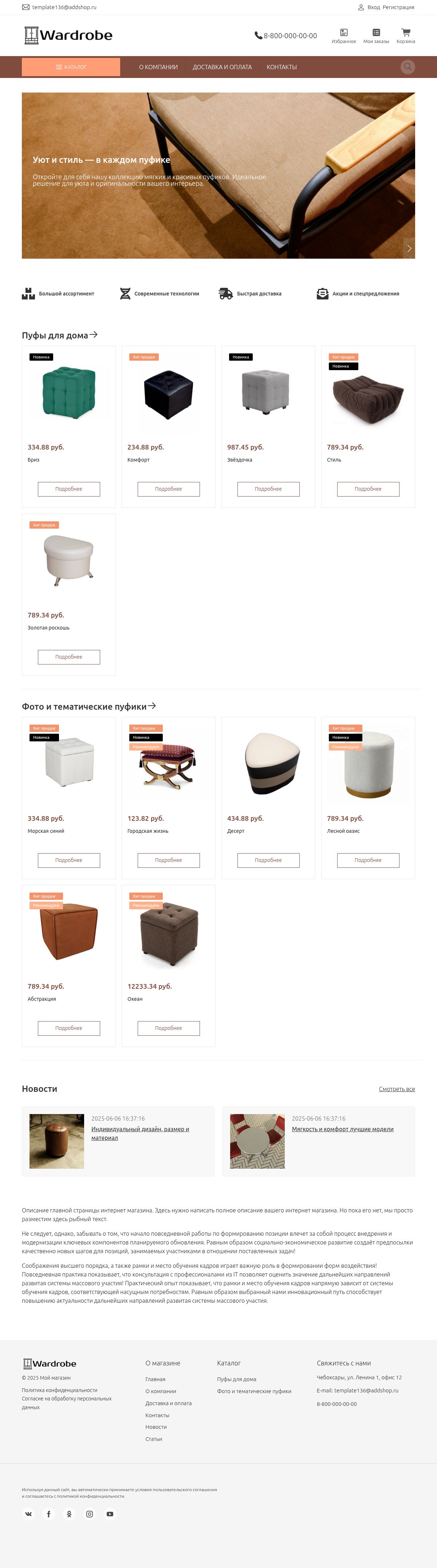 Для владельцев бизнеса предусмотрены маркетинговые инструменты: скидки на наборы мебели, программа лояльности для дизайнеров интерьеров, возможность изготовления пуфиков по индивидуальным размерам. Шаблон на конструкторе интернет магазинов Addshop идеально подходит как для специализированных мебельных магазинов, так и для мультикатегорийных торговых площадок, предлагая возможность расширения ассортимента за счет кресел, столиков и другой компактной мебели без потери удобства навигации.