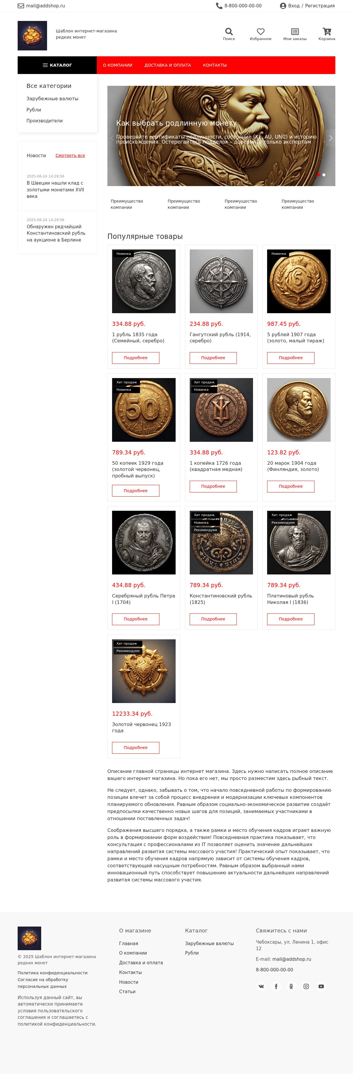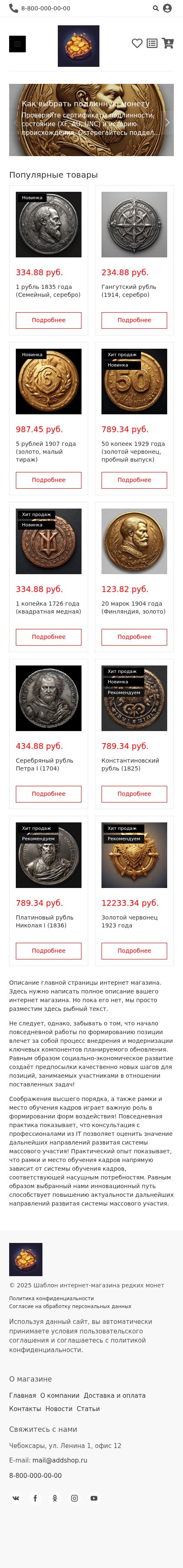 Этот шаблон интернет-магазина на Addshop создан для нумизматов и коллекционеров, где изысканный дизайн в стиле антикварного альбома с элементами геральдики подчеркивает ценность каждого лота. Главная страница оформлена как витрина старинного банка — здесь в тематических витринах представлены золотые червонцы, редкие советские монеты, средневековые денарии и современные инвестиционные экземпляры. Интеллектуальная система фильтрации позволяет сортировать коллекции по эпохам (от античности до современных юбилейных выпусков), металлам (золото, серебро, бронза), состоянию (UNC, XF, VF) и редкости (по каталогам Краузе и Узденикова). Особое внимание уделено интерактивному "Кабинету эксперта" с увеличительным стеклом для детального изучения гурта и легенды, а также разделу "История одного экземпляра" с архивными документами о происхождении особо ценных монет.