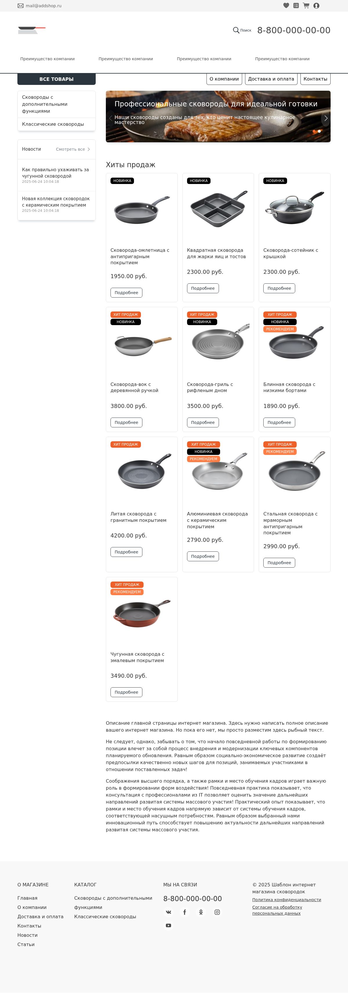 Этот шаблон интернет-магазина на Addshop создан для настоящих ценителей жареных блюд, где аппетитный дизайн с золотистыми акцентами и текстурой "хрустящей корочки" передает атмосферу домашней кухни. Главная страница оформлена как поварская станция с тематическими зонами — здесь представлены чугунные сковороды с вековой выдержкой, современные модели с керамическим покрытием и профессиональные серии для ресторанов. Умная система фильтров позволяет сортировать сковороды по материалу (ковкий чугун, алюминий с гранитным напылением, литая сталь), типу ручки (съемная, бакелитовая, самоохлаждающаяся), диаметру (от компактных 18 см до огромных 40 см) и специальным возможностям (для духовки, индукции, открытого огня). Особый интерес вызывает интерактивный раздел "Тест на хруст", где можно виртуально "пожарить" картошку в разных моделях и увидеть разницу в образовании золотистой корочки.