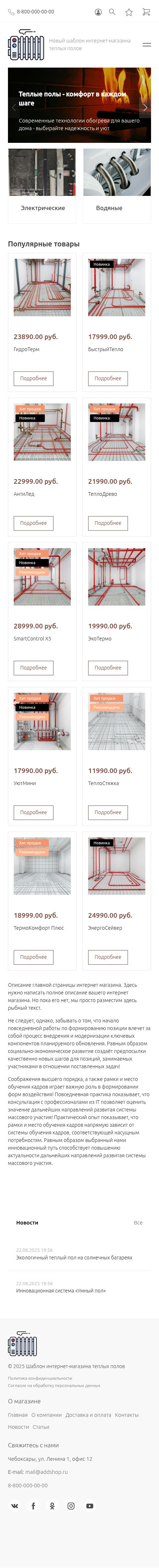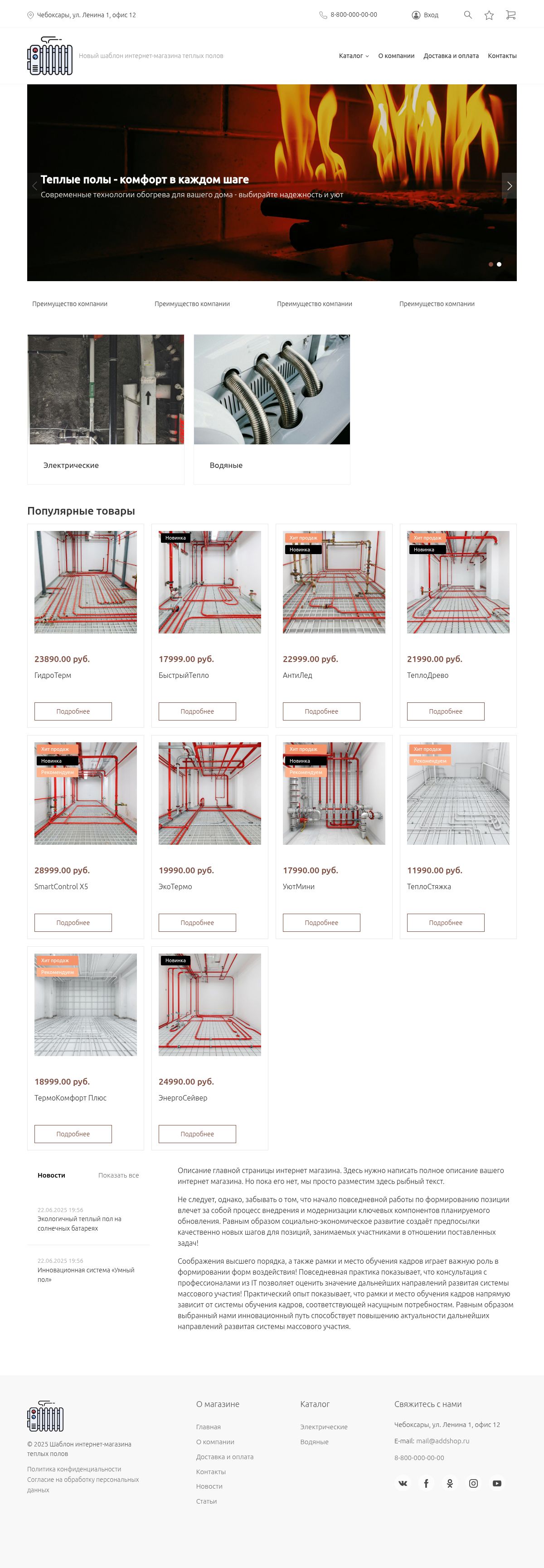 Этот профессиональный шаблон интернет магазина разработан для быстрого запуска онлайн-продаж систем обогрева пола на платформе Addshop. Он сочетает в себе техничную подачу информации с удобным интерфейсом, адаптированным под потребности покупателей, выбирающих сложные инженерные решения для дома. Адаптивный дизайн обеспечивает корректное отображение каталога на всех устройствах, включая мобильные, где сегодня совершается более 60% покупок.
