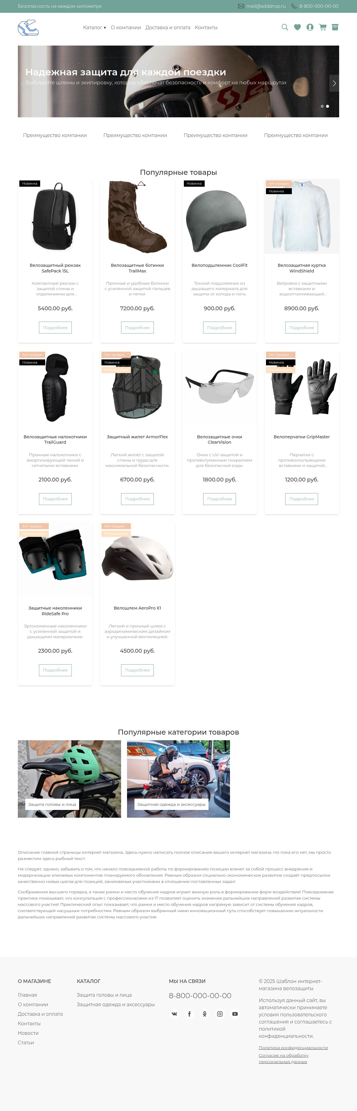 Особенностью шаблона является интерактивный "Конфигуратор безопасности", помогающий подобрать полный комплект защиты под конкретный стиль катания (прогулочный, спортивный, BMX). Раздел "Кейсы безопасности" наглядно демонстрирует последствия падений с разной защитой и без нее. Для наглядности реализованы 360° просмотры шлемов с выделением ударопоглощающих зон, а также видео-тесты продукции.