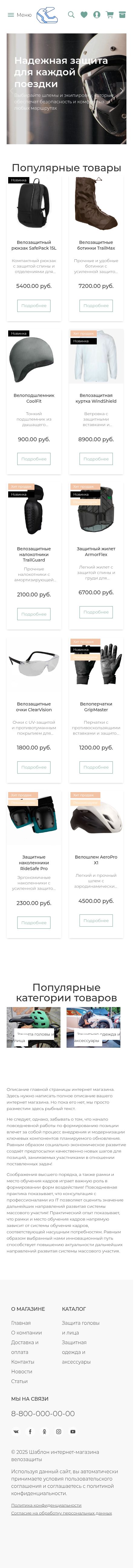 Главная страница оформлена с акцентом на основные категории товаров: шлемы (городские, шоссейные, MTB), защитные очки, наколенники, налокотники, перчатки и светоотражающие элементы. Каждая карточка товара содержит детальные технические характеристики: материалы ударопрочной оболочки, система вентиляции, вес, регулировки, сертификаты безопасности (CE, CPSC). Уникальная система фильтров позволяет сортировать товары по уровню защиты (город/экстрим), возрасту (взрослые/дети), сезонности и совместимости с другими элементами экипировки.