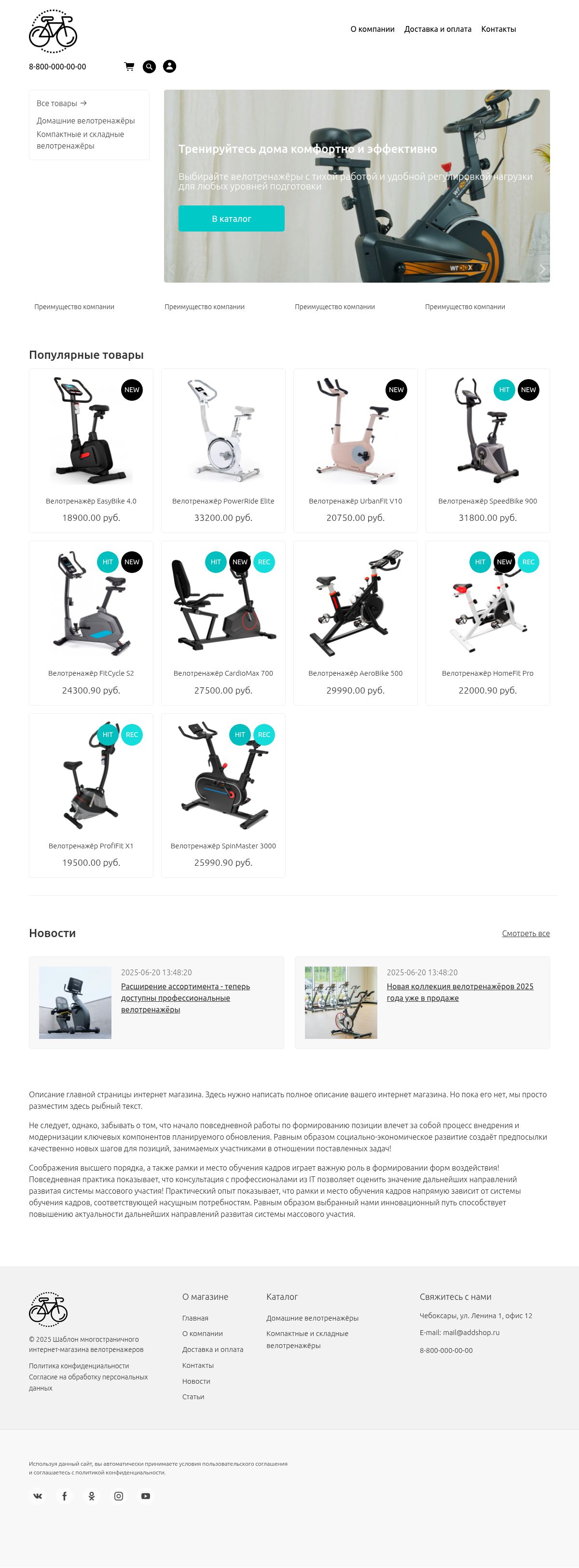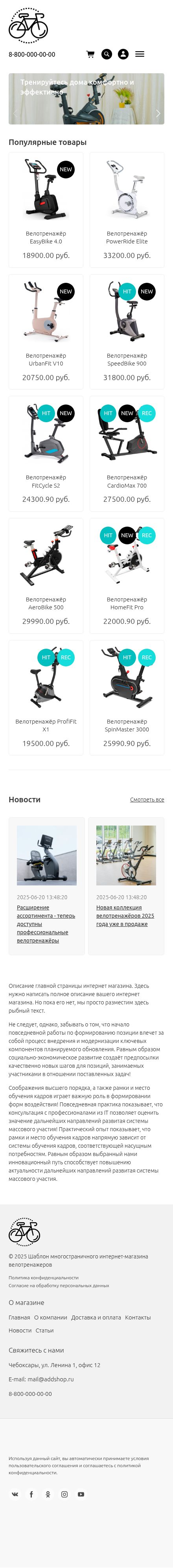 Профессионально разработанный шаблон интернет-магазина для успешных онлайн-продаж спортивного оборудования с акцентом на велотренажеры различных типов. Технологичный дизайн с динамичными элементами подчеркивает современность предлагаемой продукции, создавая атмосферу фитнес-клуба прямо на сайте. Адаптивная верстка обеспечивает безупречное отображение каталога на всех устройствах, что особенно важно для клиентов, выбирающих оборудование для домашних тренировок.
