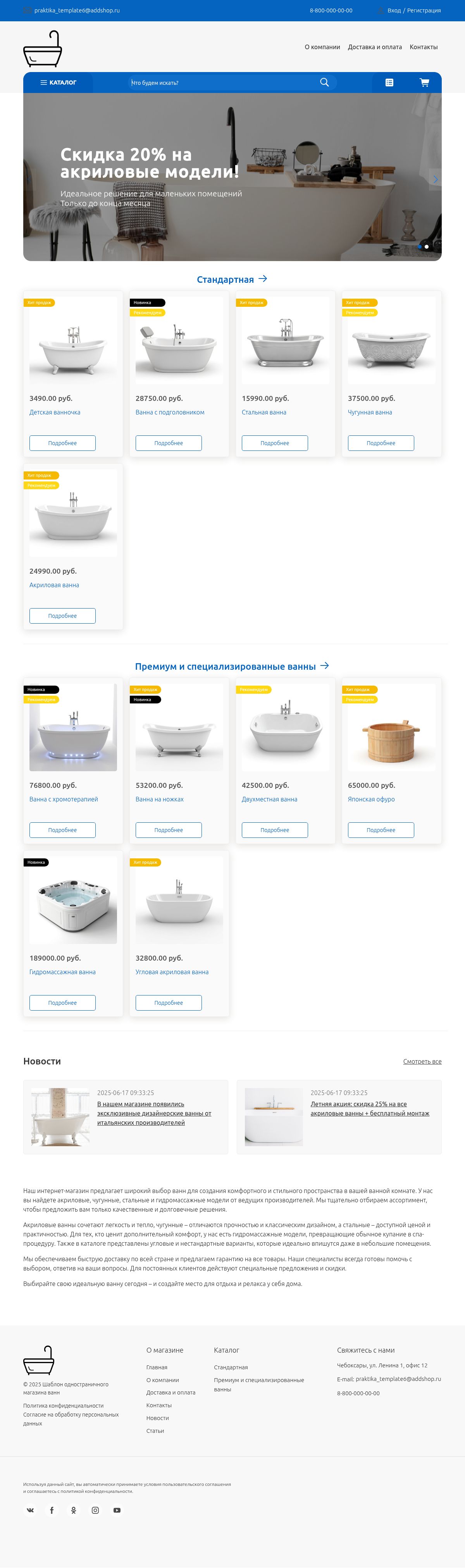 Готовый шаблон интернет магазина одностраничного магазина ванн на Addshop — это комплексное решение для презентации сантехнической продукции премиум-класса с акцентом на визуальную демонстрацию преимуществ. Шаблон разработан с учетом специфики продаж крупногабаритных изделий и предлагает лаконичную структуру с последовательным раскрытием информации: от общих преимуществ моделей до детализированных характеристик. Основной экран оформлен эффектным героем-баннером с роскошной ванной в интерьере, сразу задающим высокий стандарт продукции, с кнопкой быстрого перехода к конфигуратору.